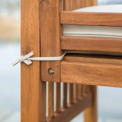 Take a seat in these durable solid wood patio chairs from Saracina Home and realize the outdoor living experience you’ve always been chasing. With a timeless slat design, these solid wood porch chairs exude a classic sense of style whether you place them in your backyard or by the pool. Each acacia wood chair comes with a UV resistant cushion that fastens with ties. Properly care for your outdoor acacia furniture by keeping it out of severe weather conditions and applying teak oil every 2-3 months.